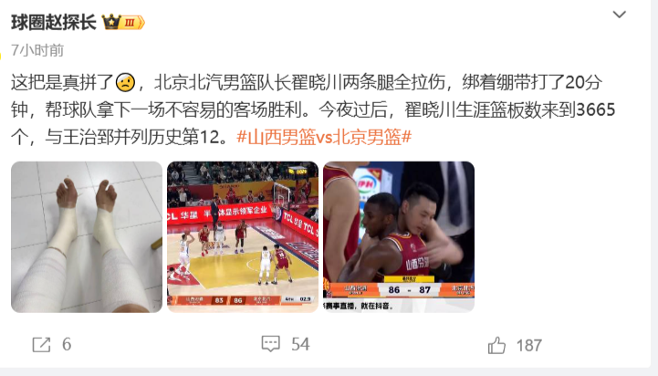 赛后媒体人“赵探长”晒出了一张翟晓川双腿缠满绷带的照片,并表示:川队这把是真拼了,北京北汽男篮队长翟晓川两条腿全拉伤,绑着绷带打了20分钟,帮球队拿下一场不容易的客场胜利。